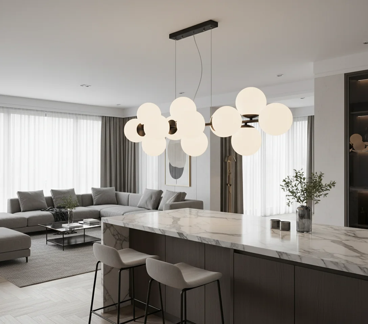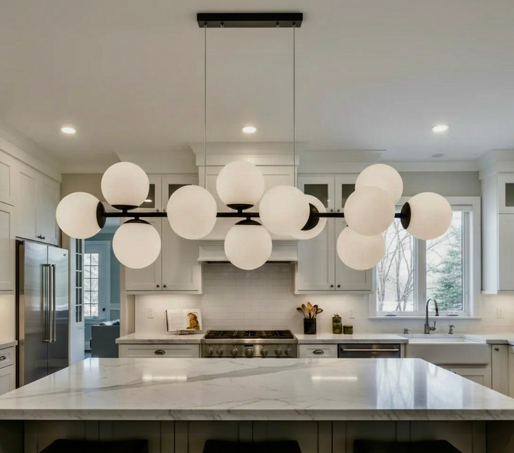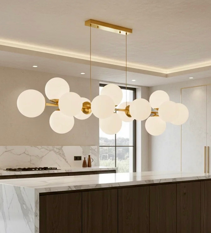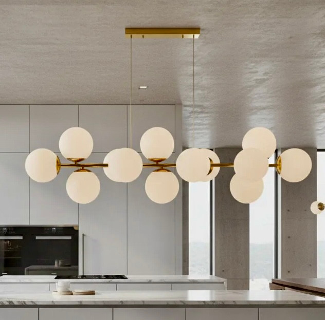 - ابعاد: طول لوستر ~۱۲۰ سانتیمتر، مناسب برای اپنها و جزیره آشپزخانه