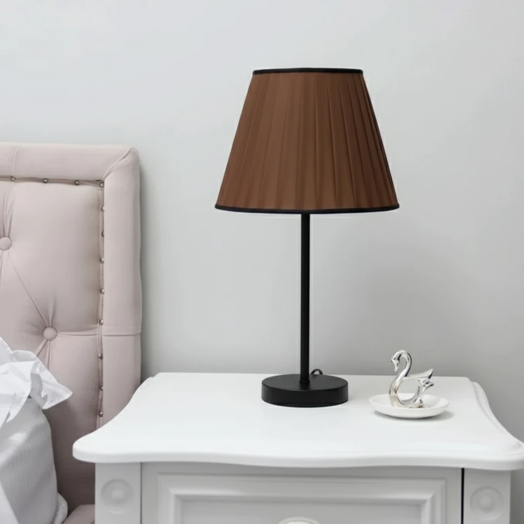 بدنه فلزی مقاوم در رنگهای متنوع (مشکی، طلایی، طوسی) همراه با شید پارچهای چیندار که نوری ملایم و دلنشین در فضا پخش میکند 🕯️