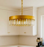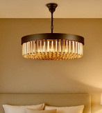 این مدل با الهام از خطوط هندسی نمایی از لوکسبودن آرامشبخش فضا را بازتاب میدهد. کریستالهای شامپاین با انعکاس نور گرم، حس طلایی ملایم ایجاد کرده و با بدنه مات تضاد دلنشینی را رقم میزنند. زنجیر فلزی بهجای پارچهای باعث دوام بیشتر و حس صنعتی لوکستر شده است.