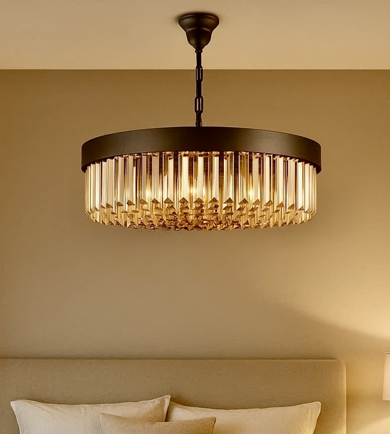 این مدل با الهام از خطوط هندسی نمایی از لوکسبودن آرامشبخش فضا را بازتاب میدهد. کریستالهای شامپاین با انعکاس نور گرم، حس طلایی ملایم ایجاد کرده و با بدنه مات تضاد دلنشینی را رقم میزنند. زنجیر فلزی بهجای پارچهای باعث دوام بیشتر و حس صنعتی لوکستر شده است.